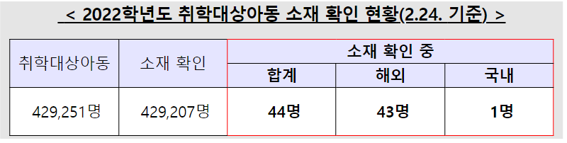ㅇ 학교는 교육(지원)청·지자체와 협력하여 취학대상아동 429,251명 중 99.9{cc9827aa6d0791696556b24712def8451c0c7de3b1bdb74bb8d822bb91612452}에 해당하는 428,972명의 소재를 확인하였고, 미확인된 279명을 경찰에 수사를 의뢰하였다.